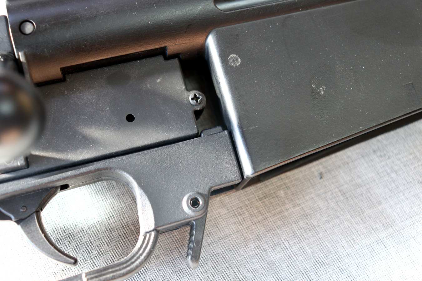これがかなりきつめですが、先ずはトリガーガードのネジ穴付近を真上に引き上げてください。